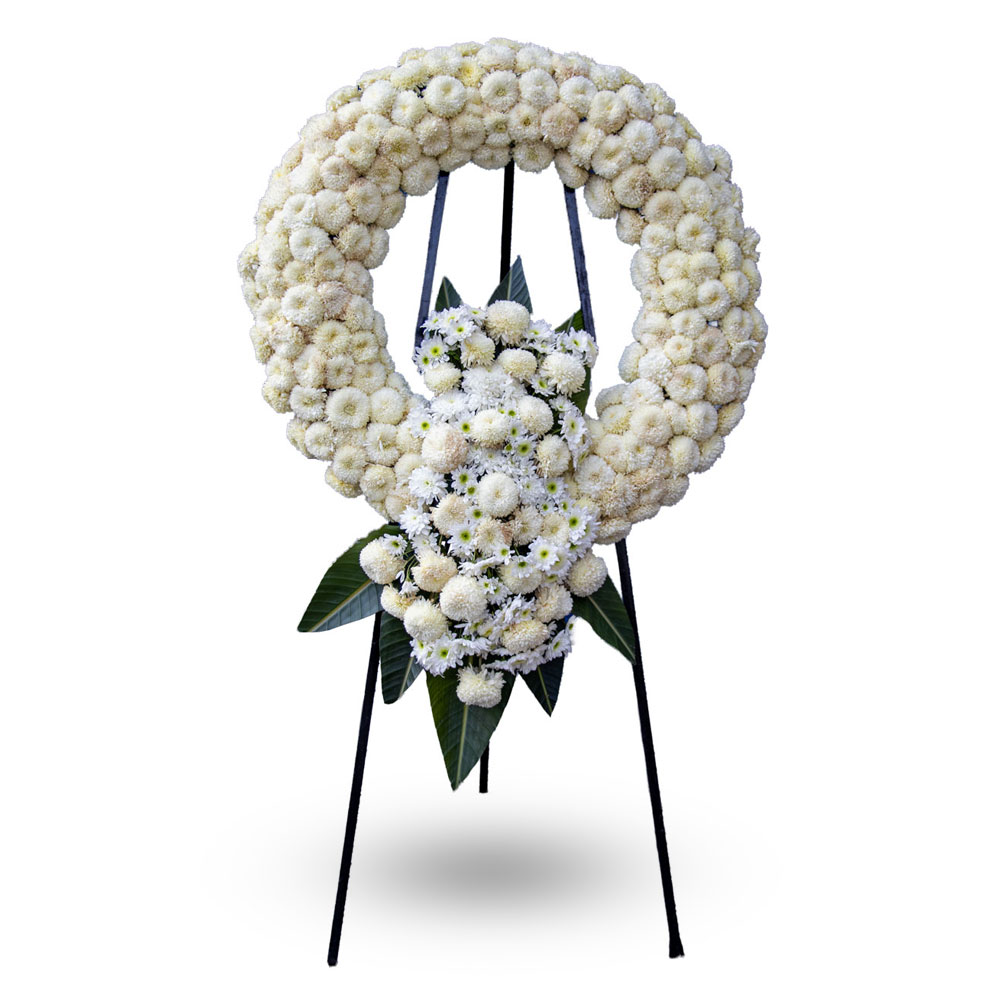 تاج گل شامل 30 دسته داوودی مهندسی و 5 دسته داوودی سفید، به همراه تزئینات و گلآرایی میباشد. با عرض 1 و ارتفاع 2 متر.