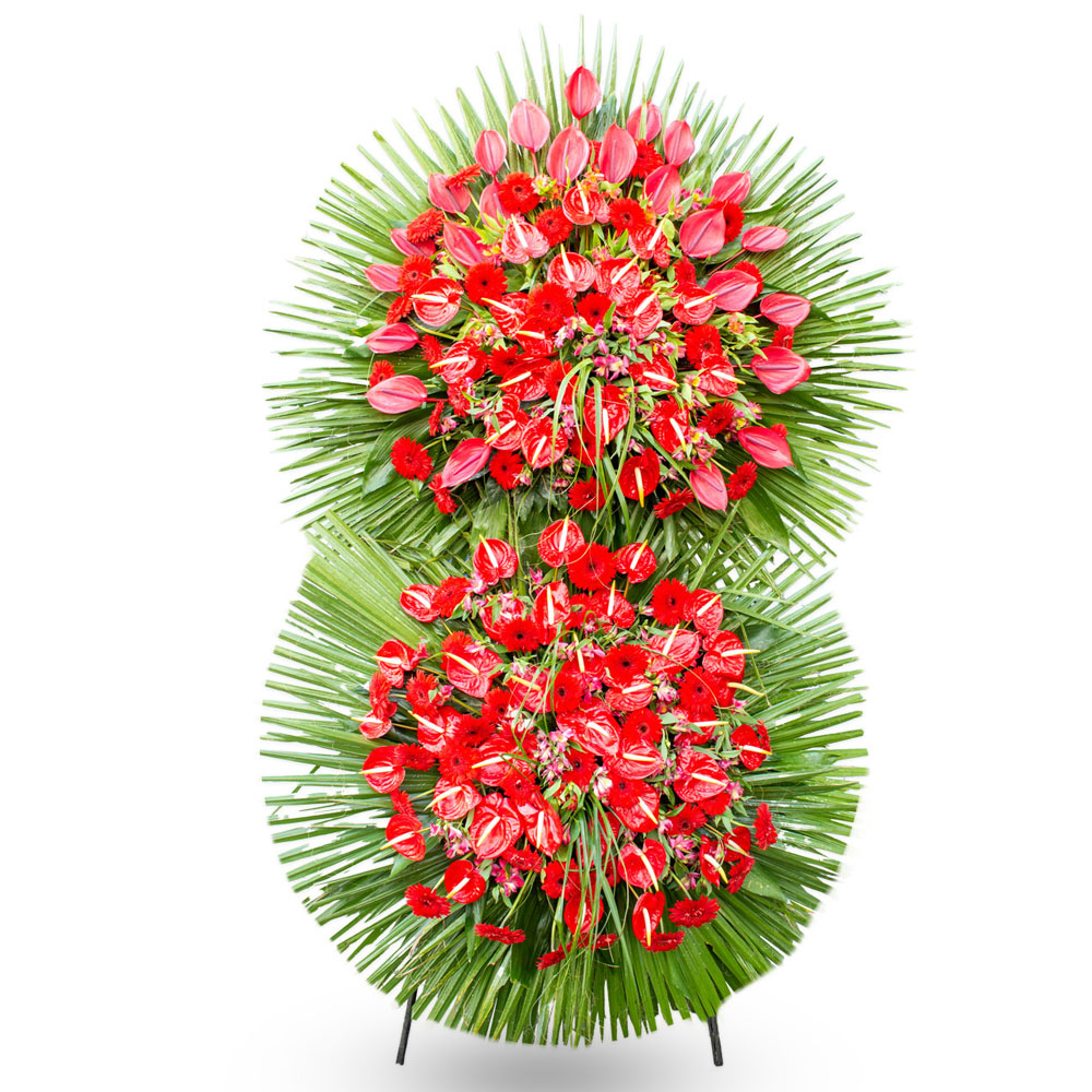 تاج گل شامل 90 شاخه آنتوریوم، 60 شاخه ژربرا و8 دسته آلسترومریای 10 شاخهای به همراه تزئینات و برگآرایی میباشد؛ با عرض 1 متر و 10 سانتیمتر و ارتفاع 2 متر و 30 سانتیمتر.