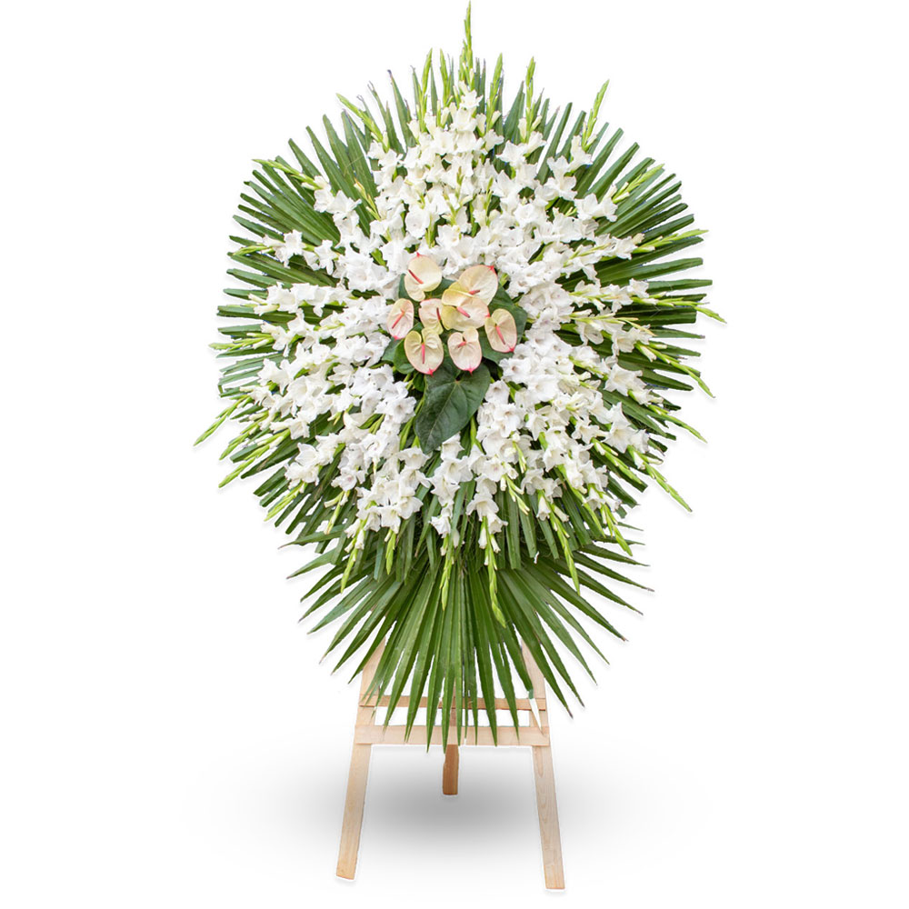 تاج گل شامل 50 شاخه گلایل و 8 شاخه آنتوریوم، به همراه تزئینات و برگآرایی میباشد. با عرض 150 و ارتفاع 250 سانتیمتر.